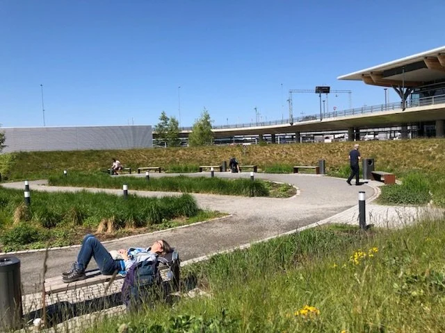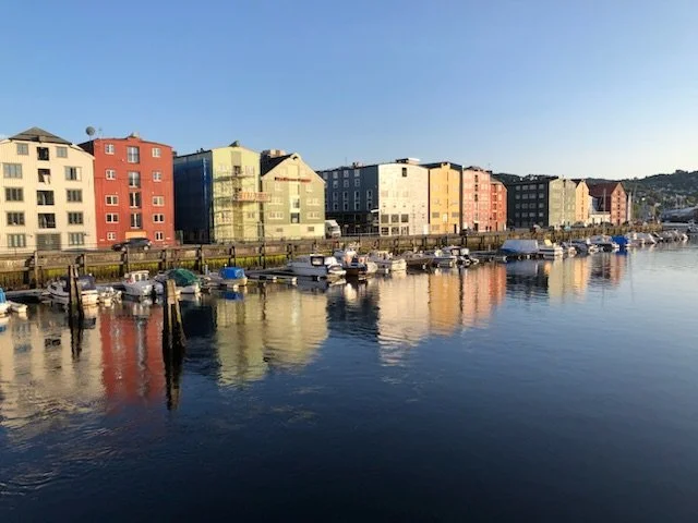 An early start from London but an easy trip to Oslo. We arrived with three hours to spare before our train to Trondheim. Mellany decided to take her nap in the sunshine adjacent to the airport terminal. We both fell asleep in the warm sun which refreshed us prior to 6 hour train journey to Trondheim. The journey was a spectacular one, past lakes and rivers before ascending a snowy plateau and then descending into Trondheim which was bathed in beautiful evening sunshine.
