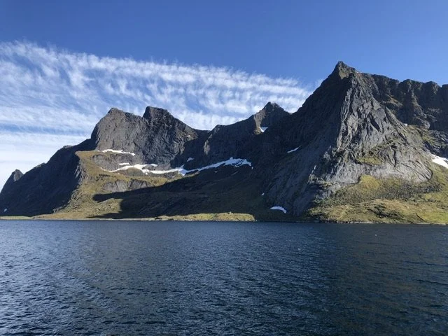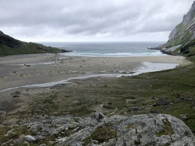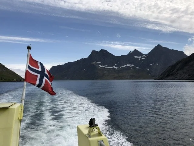 After lunch, which was freshly baked bread and Norwegian cheese from local shop Circle K, we set off in bright sun on the Reinefjorde ferry inland across the fjord. The plan was to alight at Vinstad and walk to Bunes beach, on the wild other side of the island, called the outer side. On the ferry we began to feel slightly alarmed by a) the dark grey cloud we were sailing towards and b) the age of everyone else on the boat being substantially younger than us. So far we’d mostly come across people our age or older driving white camper vans. Were we taking on too much?